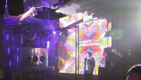 Multiple projectors fed by live cameras on the dance floor light up the beautiful architecture of a courtyard in the Getty Museum.